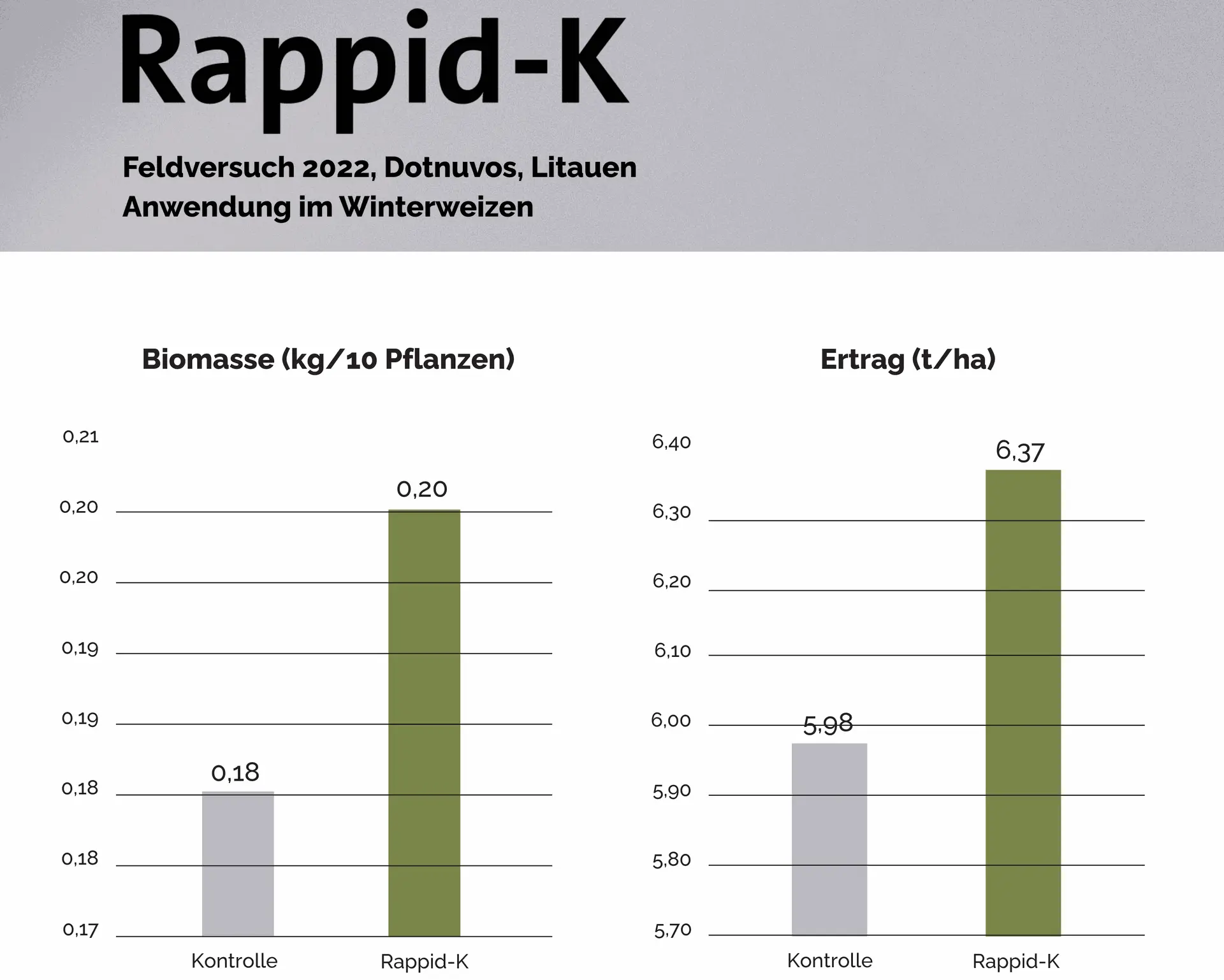 Im GEP-konformen Zulassungsversuch 2022 in Dotnuvos (Litauen) wurde die Wirkung von Rappid-K auf Winterweizen unter praxisnahen Bedingungen untersucht. Ziel war es, das Potenzial des Produkts zur Ertragssteigerung und effektiveren Nährstoffversorgung zu evaluieren. Die Ergebnisse: