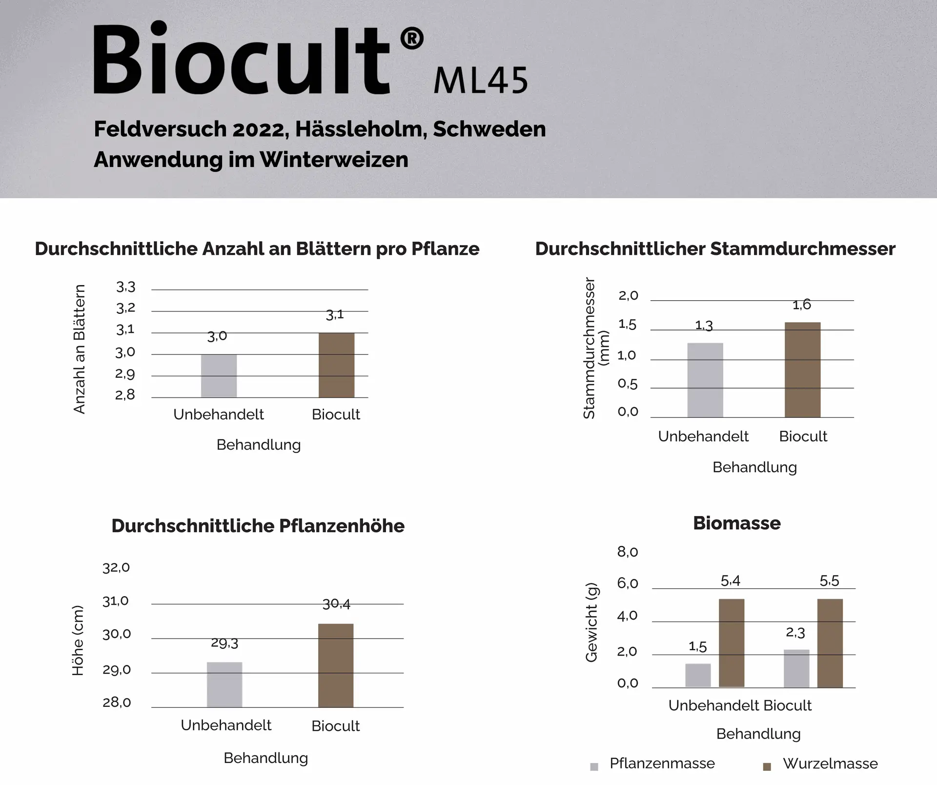 In einem 2022 durchgeführten Feldversuch in Hässleholm, Schweden, konnte Biocult® ML 45 signifikante Vorteile gegenüber der unbehandelten Kontrollgruppe zeigen. Der Einsatz des Produkts führte zu einer deutlichen Steigerung folgender Parameter:
